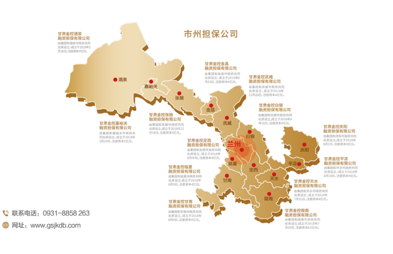 甘肅金控融資擔保集團股份有限公司(簡稱金控擔保)是由甘肅省財政廳出資,甘肅金融控股集團有限公司發(fā)起,經(jīng)甘肅省地方金融管理局核準而設立的省級政府性融資擔保機構,甘肅省人民政府確定的省級融資再擔保機構,國家融資擔?;鸷灱s合作單位。連續(xù)四年資本市場主體信用AAA評級為穩(wěn)定,連續(xù)五年榮獲甘肅省“省長金融獎”,被評為甘肅省先進基層黨組織、省屬企業(yè)黨建融入生產(chǎn)經(jīng)營典型創(chuàng)建示范點、“萬企興萬村”甘肅行動典型金融機構、首屆“甘肅社會責任企業(yè)”。